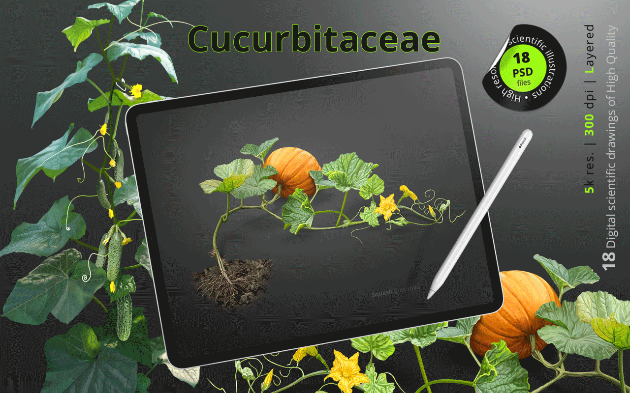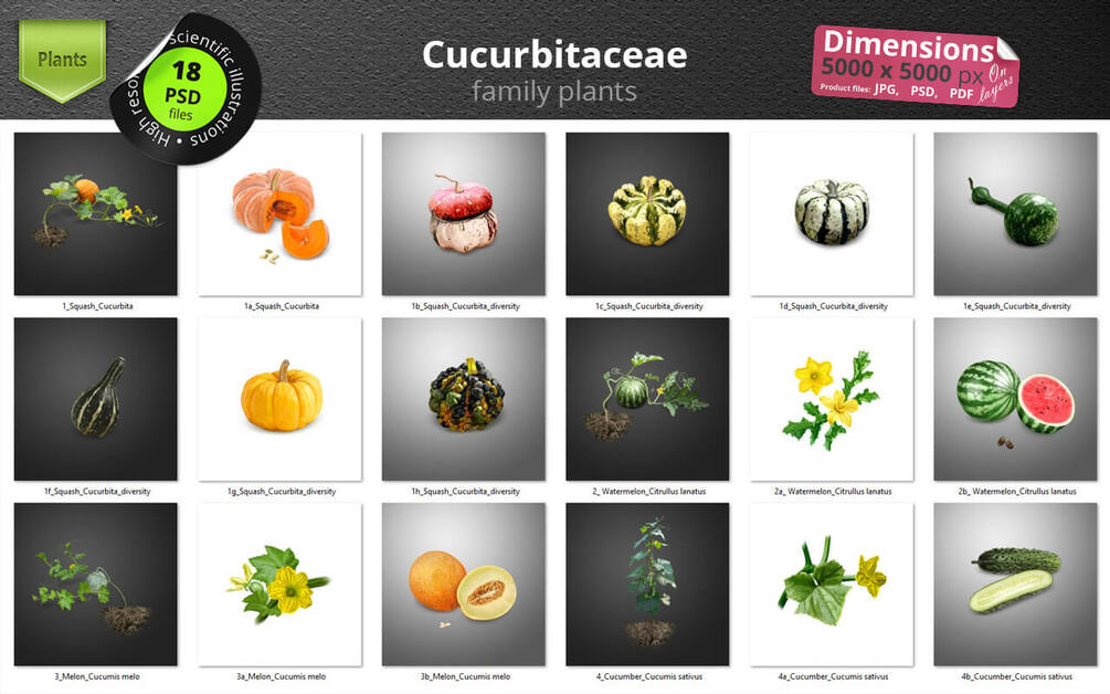 Vegetables. Cucurbitaceae. 18 Digital scientific illustrations (photorealistic drawings) of High Quality.