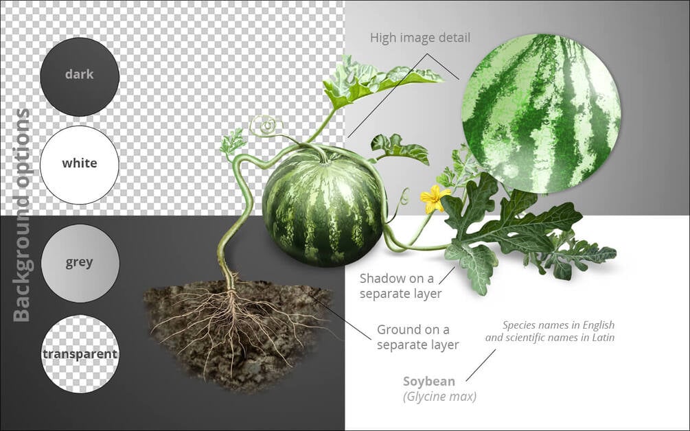 · 18 individual PSD image files (layered, transparent background, shadows on a separate layer). Digital scientific drawings of high resolution and high image detail (5000 × 5000 px, 300 dpi). Note: Turn on layer visibility in PSD files.